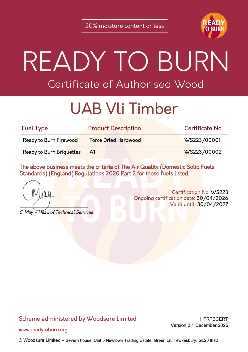 Woodsure – Ready to burn certificateThe Woodsure Certification scheme (Scheme No. WS223) comprehensively checks woodfuel producers to ensure that they produce and supply woodfuel to the correct standard.