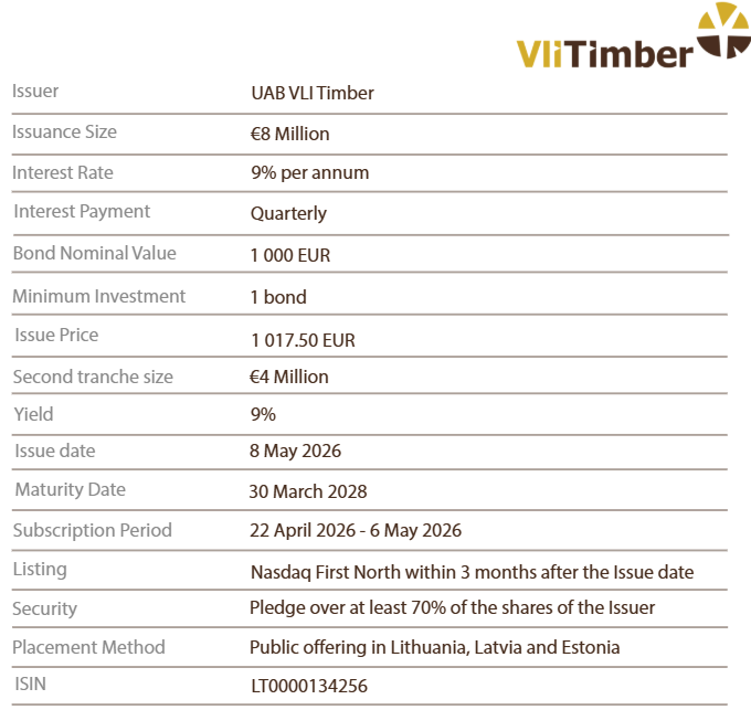 VLI Timber is issuing bonds to raise working capital for the development of a new production facility in Jonava. The plant is expected to start operations in 2027 and will increase the company’s processing capacity from 120,000 m³ to more than 300,000 m³ of wood per year. Bond proceeds will primarily be used to finance equipment procurement, a critical step in launching operations.